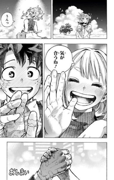 在漫畫的最終話(第430話)中,故事的焦點放在大戰結束後的世界,以及英雄們如何迎向和平的未來。然而,許多粉絲發現,在這一話裡,並沒有出現大家期待已久的、綠谷與麗日正式告白或交往的場景。 漫畫的結尾將重心放在了綠谷即使失去OFA個性後,其英雄精神如何傳承下去,以及夥伴們對他的支持,特別是爆豪勝己為他送上裝備,象徵兩人關係的昇華。